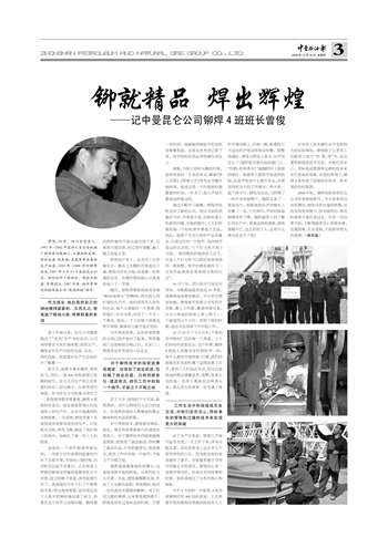 2008年初,铆焊四班荣获昆仑公司优秀班组称号,当大家拿到这块奖牌后,曾俊没有丝毫的骄傲,反而变得更加努力,因为他明白,现在的成绩只是代表过去,只有一切从零开始,不断增强责任心和使命感,克服困难,扎实进取,才能取得更大的成绩。(郝东磊)
