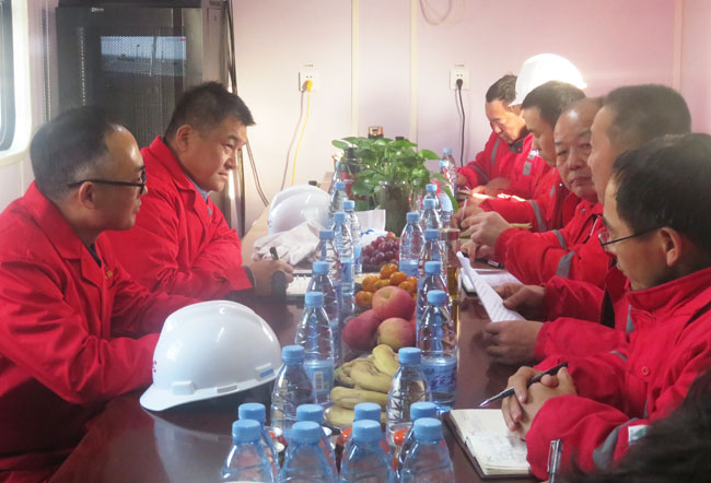 陈总代表集团领导给全体将士带来了亲切的问候,对塔里木项目一年来在超深井、高难度井施工中取得的成绩给予了充分的肯定,并介绍了国内外各项目取得的成绩,鼓励深处天山脚下的中曼42队将士再接再厉,在接下来的施工中再创佳绩。平台经理常建伟、工程主管王国栋向陈总做了工作汇报,陈总与42队员工进行了座谈交流,点评了井队的工作亮点和做法,并对2020年的工作提出期望。