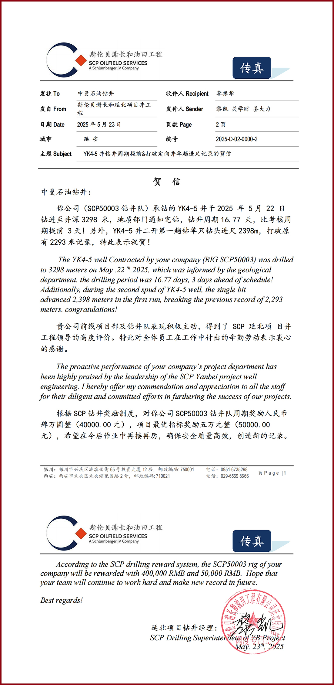 5月22日23时,由中曼钻井延安项目9队承钻的YK4-5井以用时16.77天、提前设计周期3天的成绩顺利完钻,同时创造了二开第一趟钻单只钻头进尺2398米的新纪录。甲方斯伦贝谢长和油田延北项目部发来贺信表示祝贺,并给予提前钻井周期、项目最优指标共计9万元奖励。