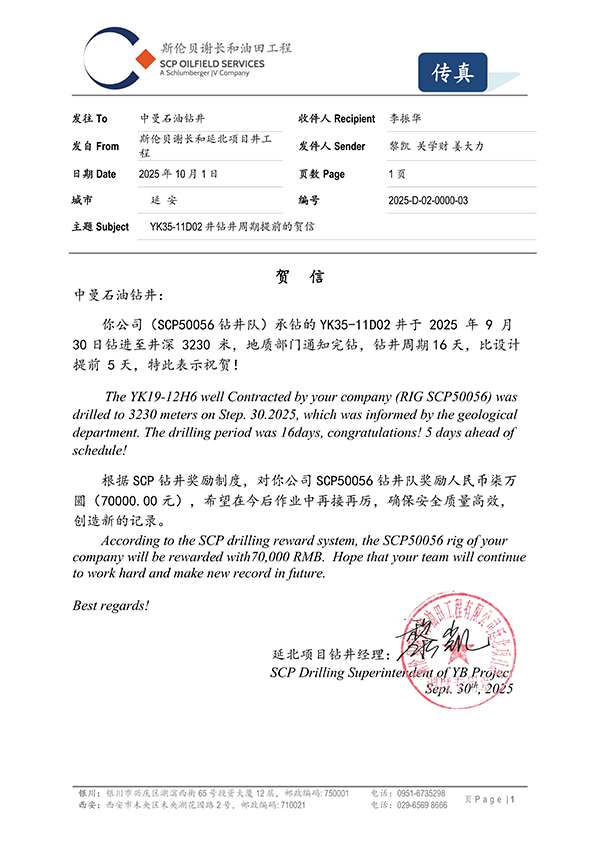 10月2日,由延安项目中曼2队承钻的YK35-11D02井以钻井周期16天、提前设计周期5天的成绩完钻,甲方斯伦贝谢长和油田公司延北项目部第一时间发来贺信,并给予7万元奖励。
