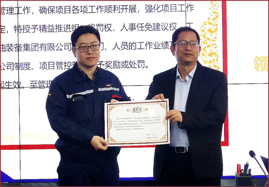 装备集团副总经理朱红亮为项目组颁发专项授权证书,各执行小组组长签订责任书,全体参会人员共同宣读《精益管理项目承诺书》,凝聚精益管理共识。