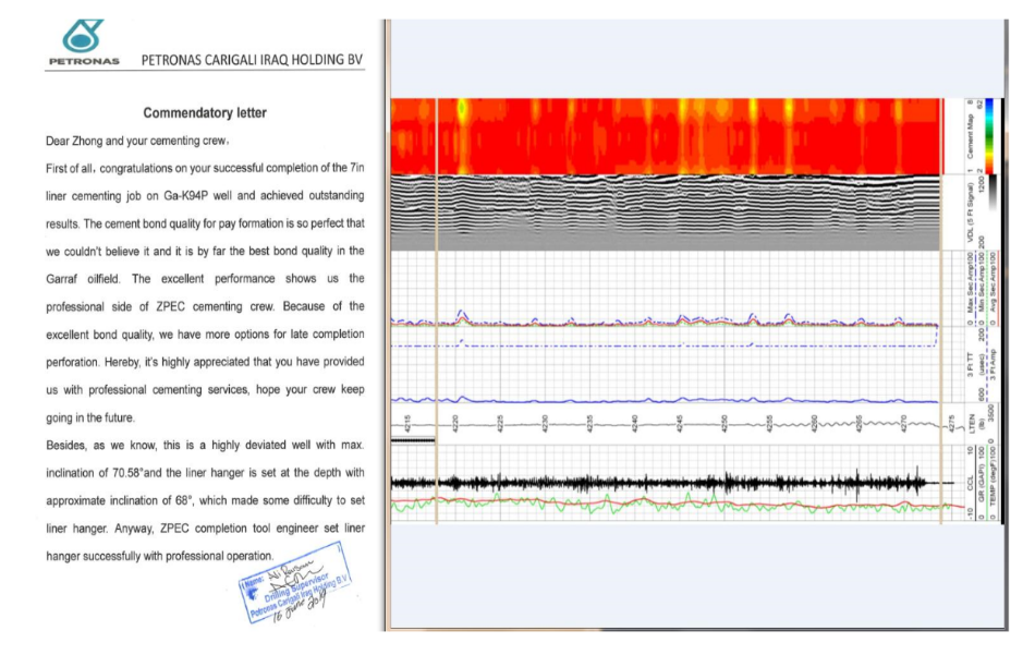 • Занял первое место в двухступенчатой оценке качества цементирования 9,625 in на нефтяном участке со средним показателем качества 83%