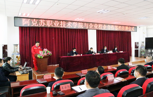 In the afternoon of March 24, 2021, Beijing Time, the signing ceremony for the first batch of regional college and enterprise cooperation in Aksu, Xinjiang, was held at Aksu Vocational and Technical College. As the first batch of school-enterprise cooperation company, ZPEC (Aksu) Oil & Gas Company was selected as "School-Enterprise Cooperation Practice Training Base ". At the signing ceremony, Mr. Bin Fang, The Deputy General Manager of ZPEC (Aksu) Oil &Gas Company, took the lead and addressed his speech on behalf of ZPEC, saying that cooperation between schools and enterprises could give full play for each other’s advantages, could not only train more high-quality and highly skilled talents for society and enterprises, but also help enterprises to attract and hire more outstanding graduates. In the next step, ZPEC (Aksu) Oil & Gas Company and Aksu Vocational and Technical College will take the form of "Order Class" to carry out deeper cooperation. At the same time, it is proposed to set up "Order Class" special scholarships and grants for petroleum engineering majors to encourage outstanding students to join the petroleum industry. Based upon ZPEC’s next 3 years’ development plans, ZPEC is about to accept around 800 local skilled graduates. With the speed up of exploration and development of oil and gas, over the past two years, ZPEC (Aksu) Oil & Gas Company has received 78 interns from Aksu Vocational and Technical College, and signed labor contracts with 59 graduates. This has greatly contributed to promoting local employment and economic development. The School-Enterprise Cooperation ceremony attracted great attention of regional departments and bureaus. The Deputy Secretary of the Aksu Prefectural Committee, the Secretary of the Aksu Education Work Committee, the Secretary and Commander of the Party Committee of the Zhejiang Provincial Xinjiang Aid Command, etc., a total of seven high level regional departments and bureaus attended the ceremony.