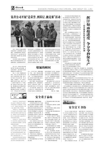 五月份开始,钻井公司上下全面掀起“安全增效”劳动竞赛及“我要安全”主题活动,从某种意义上说就是要把完成全年经营任务和安全生产充分结合起来,坚持安全和经营工作“两手抓,两手都要硬”。让大家逐步养成“我要安全”“我会安全”的习惯。其目的就是要让大家杜绝“低标准、老毛病、坏作风”,形成人人讲安全,人人懂安全,人人会安全的良好氛围。