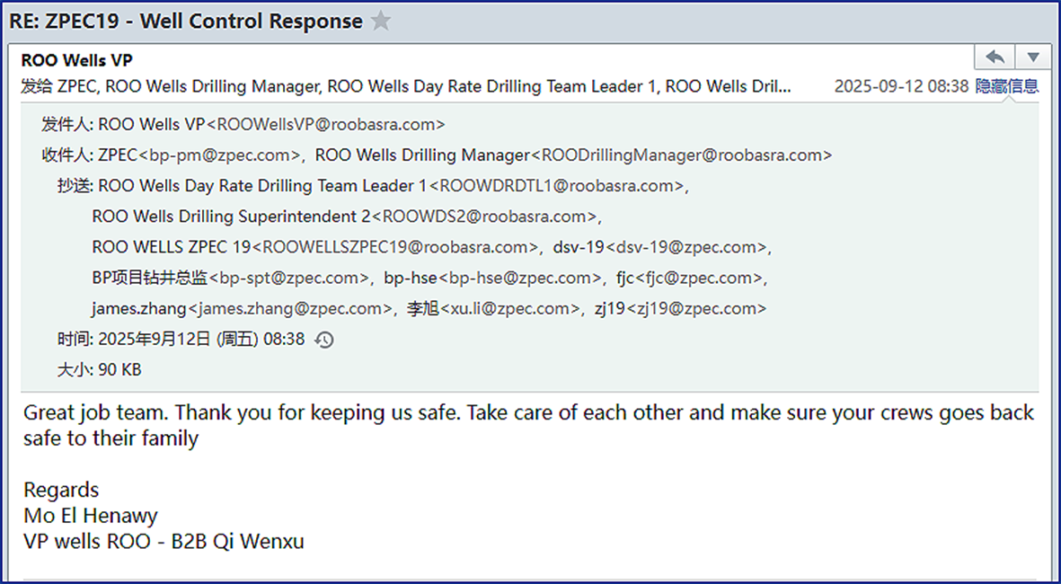 甲方副总裁Mo EI Henawy致信表示:感谢中曼19队为井控安全所做的出色努力,提供了安全可靠的工作环境,让每一位员工都能安全完成工作回家团聚。