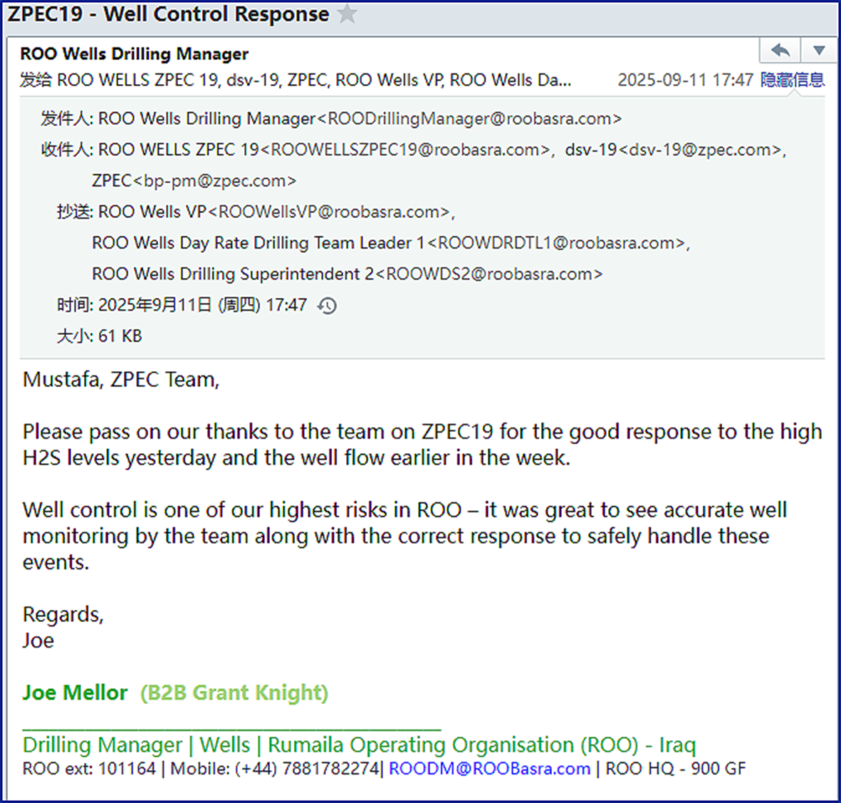 伊拉克Rumaila(ROO)钻井经理Joe Mellor致函中曼19队及分公司管理团队:“感谢中曼19队对于高浓度硫化氢事件以及本周稍早的井涌事件所做出的出色响应。井控是我们在ROO所面临的最高风险之一。此次能看到团队精准的井控监测以及正确的处置方式,并安全地控制了这些险情,非常值得称赞。”