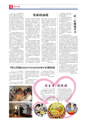 2013年7月27日,贝克休斯伊拉克项目钻井总监来到WQ-2区5号井场ZPEC-22队做一个SAFETY STAND DOWN,对井场所有人员进行安全教育。在钻井监督的安排下,井场除了司钻和一名贝克录井人员因为保障正常钻进未参加会议外,其他所有人都参加了安全教育培训。