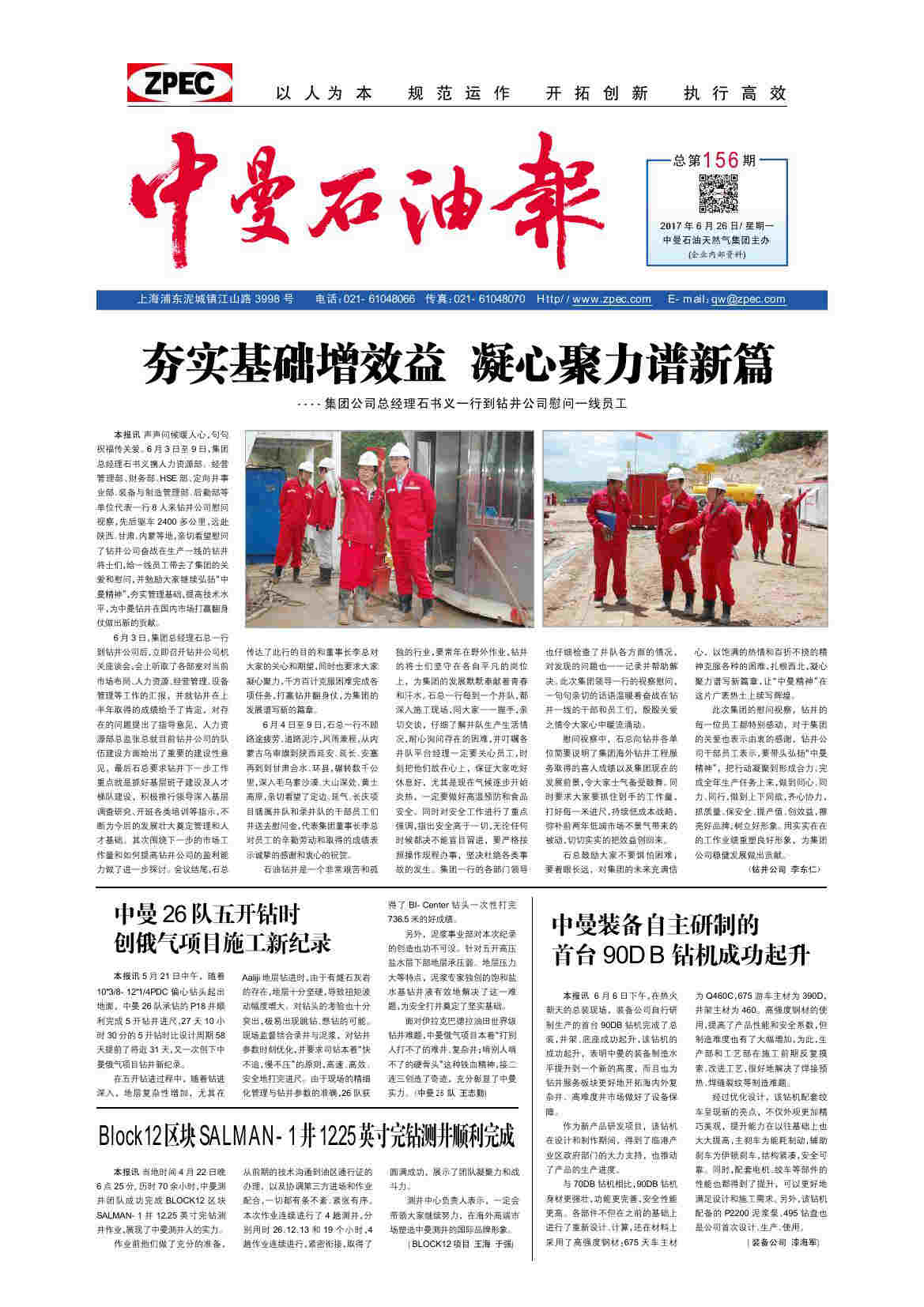 本报讯 声声问候暖人心,句句祝福传关爱。6月3日至9日,集团总经理石书义携人力资源部、经营管理部、财务部、HSE部、定向井事业部、装备与制造管理部、后勤部等单位代表一行8人来钻井公司慰问视察,先后驱车2400多公里,远赴陕西、甘肃、内蒙等地,亲切看望慰问了钻井公司奋战在生产一线的钻井将士们,给一线员工带去了集团的关爱和慰问,并勉励大家继续弘扬“中曼精神”,夯实管理基础,提高技术水平,为中曼钻井在国内市场打赢翻身仗做出新的贡献。