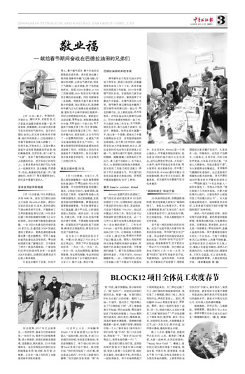 15日早上8点,井场翻译Khalid、118安保经理Yuli协同中国人一起贴对联、挂灯笼,在贴门口的福字的时候,有的是正着贴的,有的是倒着贴了,有个细心的BNI经理Sade发现了这个情况,就对我们说,“你们的字贴反了,你们看,那边是这么贴的”,中方员工就跟他们解释,“在汉语的发音里面,‘倒’和‘到’同音,福字倒着贴,表示新年到了,‘福’也到了”。在贴完以后我们就往回走,检查一遍,当我们路过BNI办公室门口的时候,看到门上缺一个福字,我问顶工,“福字哪儿去了?记得给贴了呀!”,顶工耸耸肩表示不知道。我们走进屋,看见福字贴在了电视机的墙壁上。Sade看到我们进来后,转向我们,嘴角微扬,浅浅的皱纹布满脸颊,笑眯眯的眼睛透着一股祥,他展开双臂,拥抱我们每一个人:“新年快乐!新年快乐!你们还有‘福’字吗?我门口还没有贴,再给我一个。”我告诉Sade“您等会儿,我再去给你拿一个!”。