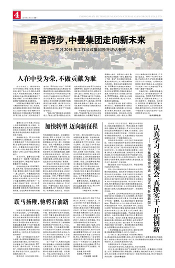 为落实响应在集团开展“认真学习集团领导新年讲话”的工作安排,钻井液事业部年前、年后分两次组织员工认真学习领会“讲话”精神,针对集团为钻井工程板块提出“我们要坚持‘抓三基、达三标’,把井队的班子建设好,带好队伍打好井”、“钻井板块升级转型的重点是五大事业部”的精神实质,结合钻井液事业部在国内外市场钻井生产中所承担的生产责任进行了认真的学习讨论,新老员工从公司发展历史、转型任务、公司市场特点、存在的困难与机遇等方面踊跃发言,献计献策。通过学习讨论大家统一了思想认识,明确了2019年事业部的任务目标,坚定了“升级转型”的信心。