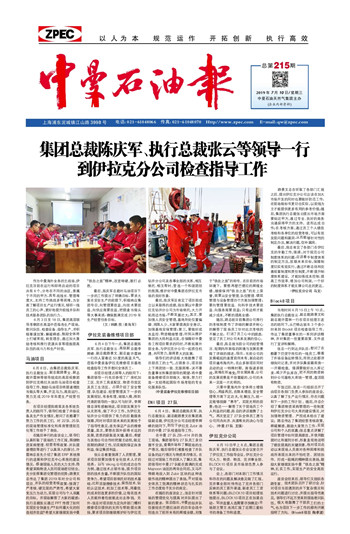 6月8日,由集团总裁陈庆军、执行总裁张云、副总裁路景文、副总裁许震林等领导组成的高层视察团到伊拉克格拉夫油田马油项目检查指导工作,勉励马油项目将提速增效当做头等大事,开足马力,高效运行,努力完成2019年年度生产经营任务。